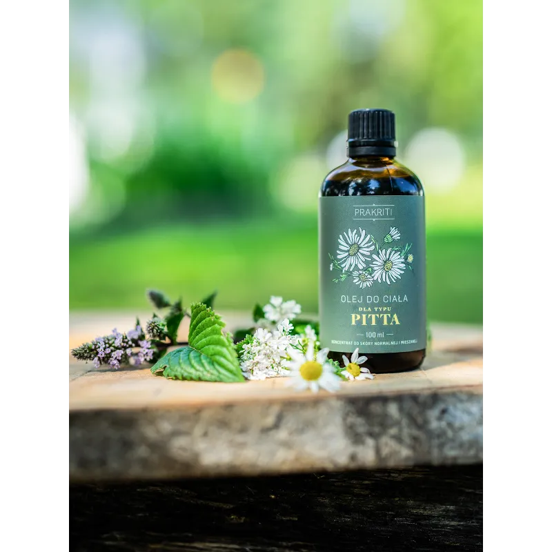 Naturalny olej PITTA został opracowany na bazie tłoczonych na zimno olejów roślinnych i ziół ajurwedyjskich, które wspierają codzienną pielęgnację skóry normalnej i mieszanej. Dzięki synergii składników, olej: