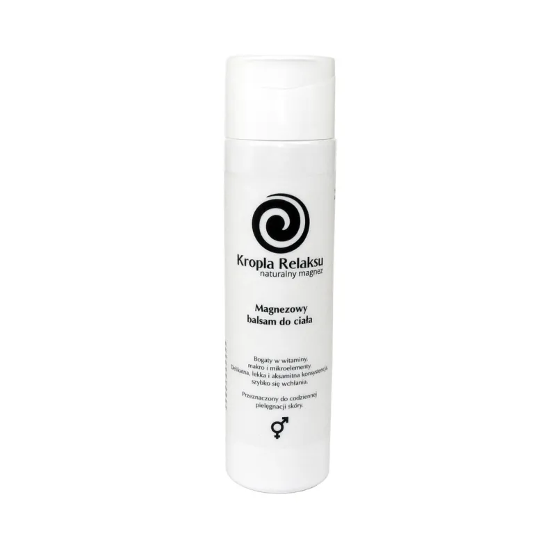 Magnezowy balsam do ciała 250 ml Kropla Relaksu to naturalny produkt pielęgnacyjny, który nawilża, regeneruje skórę i wspiera relaksację mięśni, idealny do codziennej pielęgnacji i po aktywności fizycznej.
