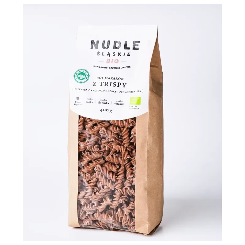 Makaron pełnoziarnisty z pszenicy okrągłoziarnowej TRISPA to wyjątkowy produkt powstały z myślą o zdrowiu i powrocie do pradawnych, wartościowych zbóż. TRISPA to nieoplewiona odmiana pszenicy o wysokiej odporności, uprawiana w sposób ekologiczny — bez stosowania środków ochrony roślin i sztucznych nawozów. Dzięki temu zachowuje pełnię naturalnych składników odżywczych i jest przyjazna dla środowiska.