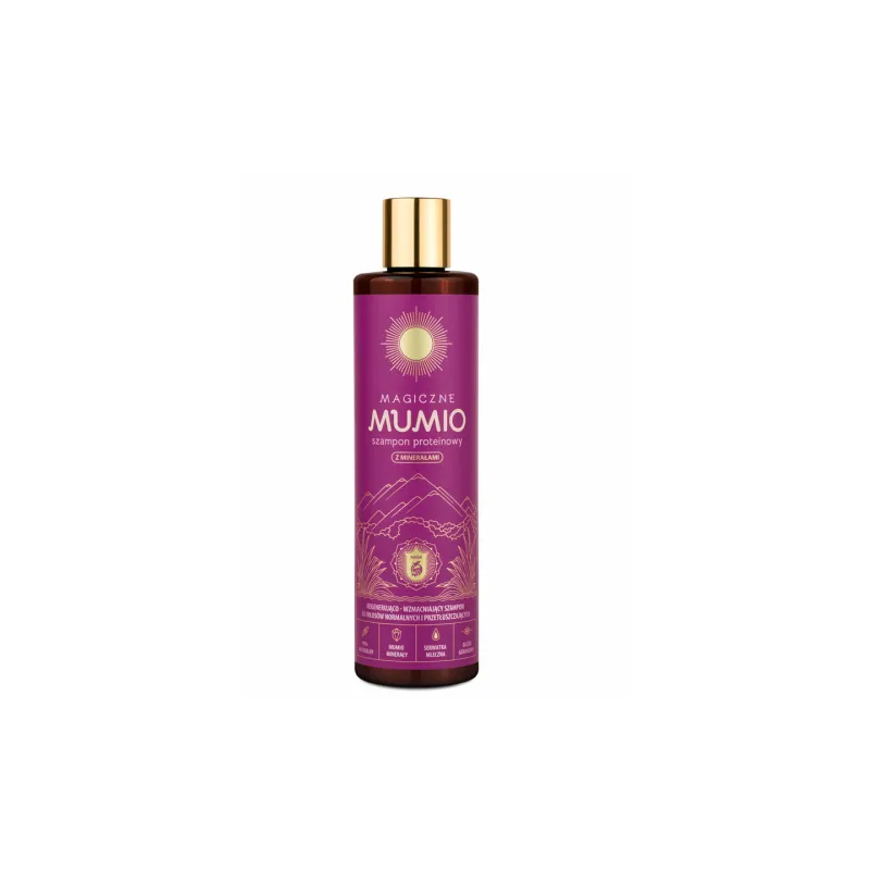 Szampon Magiczne Mumio marki NAMI, pojemność 280 ml, to naturalny preparat do codziennej pielęgnacji włosów i skóry głowy, wzbogacony o mumio – substancję mineralno-organiczną znaną z tradycyjnej medycyny naturalnej. Szampon delikatnie oczyszcza, wzmacnia włosy i wspiera ich naturalną regenerację.
