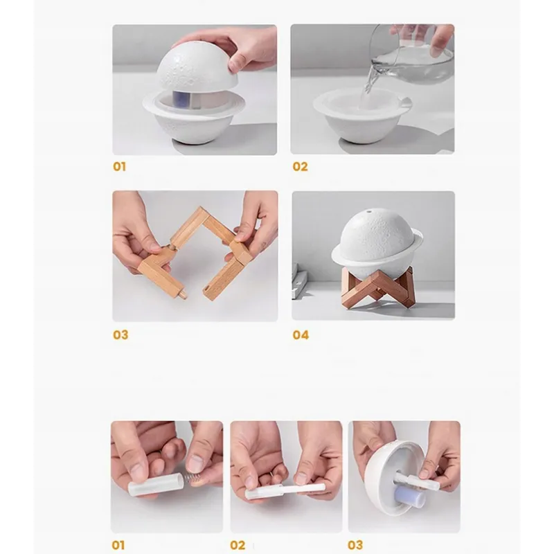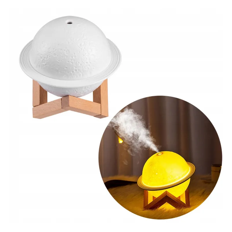 Nawilżacz Planeta Księżyc jest cichy, łatwy w obsłudze i wydajny Doskonale sprawdza się w sypialni, pokoju dziecięcym, salonie, biurze, poczekalni, sali ćwiczeń lub SPA Funkcja aromaterapii, lampki nocnej RGB i eleganckiego designu sprawiają, że urządzenie jest nie tylko praktyczne, ale również dekoracyjne