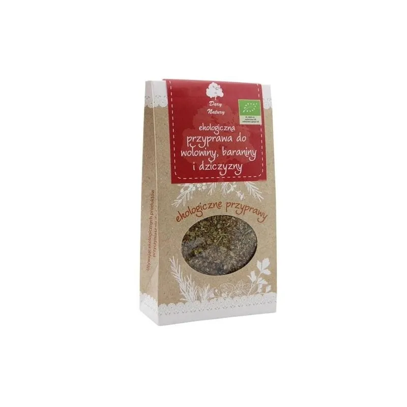 Przyprawa do wołowiny, baraniny i dziczyzny EKO to starannie skomponowana mieszanka naturalnych ziół i przypraw, stworzona z myślą o podkreśleniu smaku najbardziej wyrazistych gatunków mięs. Jej intensywnie ziołowy aromat z nutą leśnych owoców doskonale komponuje się z wołowiną, dziczyzną i baraniną.