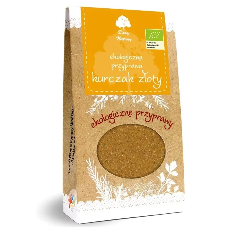 Przyprawa Kurczak Złoty EKO to aromatyczna mieszanka ziół i przypraw, która nadaje potrawom piękny, złocisty kolor i głęboki, korzenny smak. Idealna do pieczonego kurczaka i dań z drobiu.