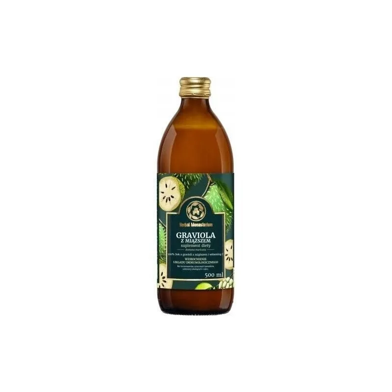 100% sok z gravioli z miąższem jest wytwarzany ze starannie wyselekcjonowanych owoców. Ze względu na wysoki poziom substancji aktywnych zawartych w gravioli, jej fitoterapeutyczne zastosowanie jest przedmiotem licznych badań. Witamina C wzmacnia funkcjonowanie układu odpornościowego i zmniejsza zmęczenie. Dzięki płynnej formie preparat ma szybki początek działania. Nie zawiera konserwantów, sztucznych barwników, substancji słodzących i cukru.