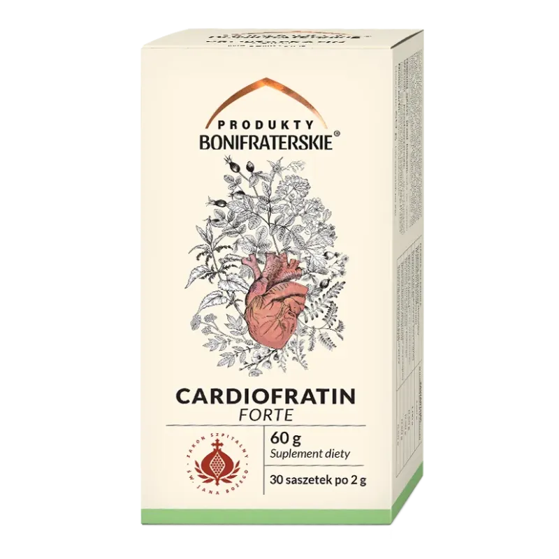 Cardiofratin Forte to naturalna mieszanka ziół opracowana zgodnie z zakoną recepturą Braci Bonifratrów. Produkt dostępny w praktycznych saszetkach do zaparzania ułatwia codzienne przygotowanie naparu wspierającego prawidłowe funkcjonowanie układu sercowo-naczyniowego i krążenia krwi.