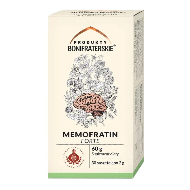 Memofratin Forte to naturalna mieszanka ziół opracowana zgodnie z zakoną recepturą Braci Bonifratrów. Produkt dostępny w praktycznych saszetkach do zaparzania wspiera prawidłowe funkcje poznawcze, pamięć i koncentrację, a także chroni przed stresem oksydacyjnym i wspomaga układ sercowo-naczyniowy.