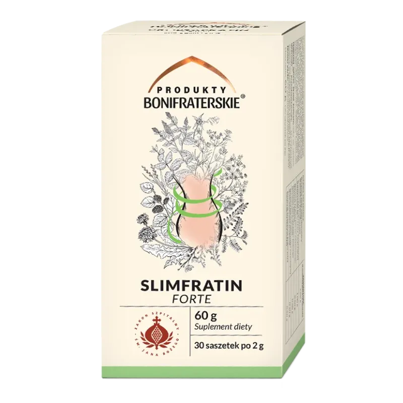 Slimfratin Forte to naturalna mieszanka ziół opracowana zgodnie z zakoną recepturą Braci Bonifratrów. Produkt dostępny w praktycznych saszetkach do zaparzania wspiera kontrolę apetytu, prawidłową masę ciała oraz funkcjonowanie układu pokarmowego, ułatwiając codzienną profilaktykę zdrowego trawienia.