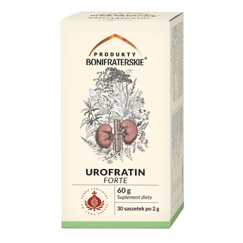Urofratin Forte to naturalna mieszanka ziół opracowana zgodnie z zakoną recepturą Braci Bonifratrów. Produkt dostępny w praktycznych saszetkach do zaparzania wspiera prawidłowe funkcjonowanie nerek, utrzymanie zdrowych dróg moczowych oraz działanie moczopędne i odkażające.