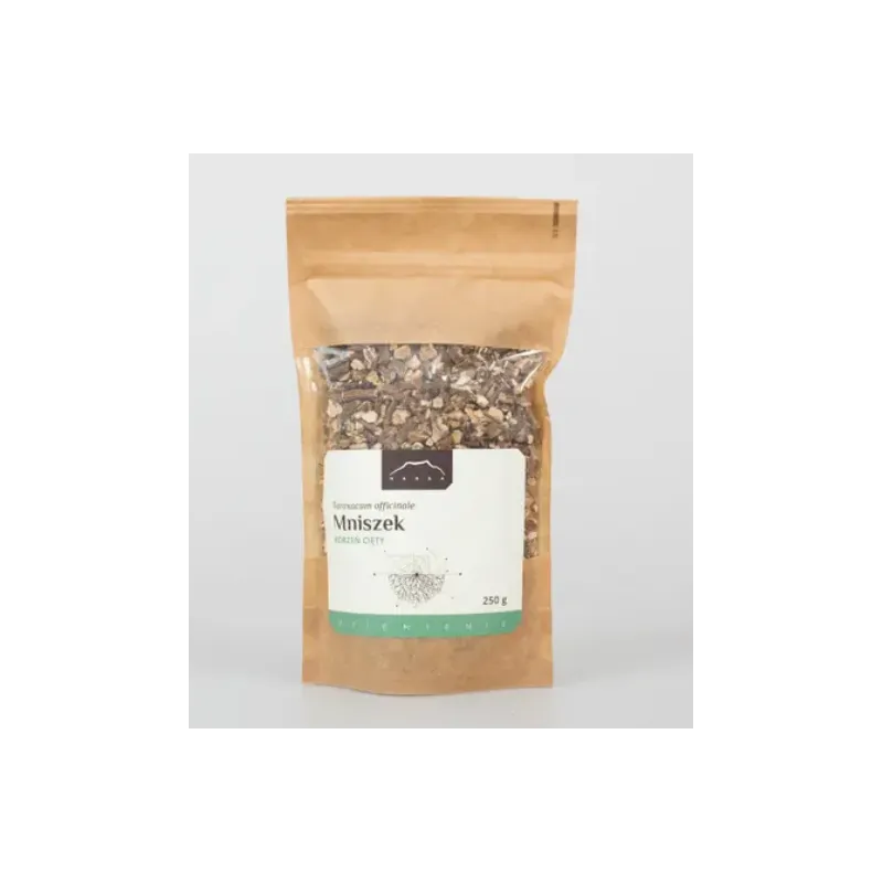 Mniszek lekarski (Taraxacum officinale) – roślina pospolicie występująca w Polsce, przez wielu uznawana za trudny do wyplewienia chwast. Przy ziemi tworzy rozetę liściową, z której wyrasta prosta łodyga z żółtym koszyczkiem kwiatowym na szczycie. Od wiosny pojawia się na łąkach, przydrożach i trawnikach w Europie, Azji i Ameryce Północnej. Ta łatwo dostępna roślina zawiera w sobie wiele cennych składników aktywnych. Docenianym surowcem zielarskim jest m.in. korzeń, mający w swoim składzie: laktony seskwiterpenowe, garbniki, związki triterpenowe, inulinę, fitosterole oraz duże ilości składników mineralnych, zwłaszcza potasu. Od wieków mniszek lekarski znajduje wiele zastosowań zarówno w medycynie naturalnej, jak w kuchni. Dawniej sok z łodyg wykorzystywano do łagodzenia zmian skórnych, a świeże liście dodawano do sałatek i zup. Współcześnie mniszek doceniany jest szczególnie za swój dobroczynny wpływ na zdrowie wątroby i pęcherzyka żółciowego. Herbatki z korzenia przyczyniają się do poprawy łaknienia oraz mogą okazać się pomocne po obfitym posiłku. Właściwości prozdrowotne: Wspiera dobrą kondycję wątroby i pęcherzyka żółciowego. Stymuluje produkcję żółci. Wspomaga prawidłowe trawienie. Składniki: Korzeń mniszka 100%. Mniszek lekarski – korzeń cięty i mielony zbierany z naturalnych, czystych terenów. Produkt najwyższej jakości! Kraj pochodzenia: Polska. Zalecany sposób użycia: Odwar: 1 łyżkę korzeni zalać szklanką wody, doprowadzić do wrzenia i gotować przez 10 minut na wolnym ogniu. Wypijać 3 razy dziennie po szklance odwaru. Sposób przechowywania: Przechowywać w miejscu niedostępnym dla dzieci! Przechowywać w suchym i chłodnym miejscu. Chronić przed bezpośrednim światłem słonecznym.