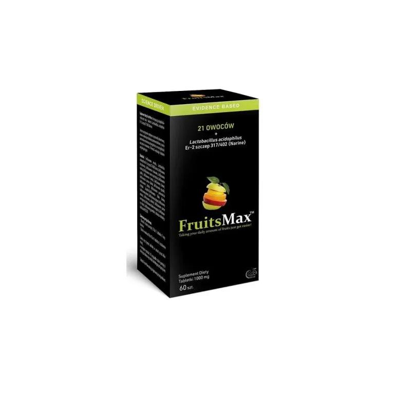 FruitsMax w formie tabletek do ssania to kompozycja składników roślinnych oraz bakterii Lactobacillus acidophilus Er-2 szczep 317/402 Narine. Jeżyna pozytywnie wpływa na przewód pokarmowy, ananas wykazuje działanie przeciwcelulitowe, czarna porzeczka wzmacnia cały organizm, a w szczególności naczynia krwionośne. Winorośl wykazuje działanie antyoksydacyjne.