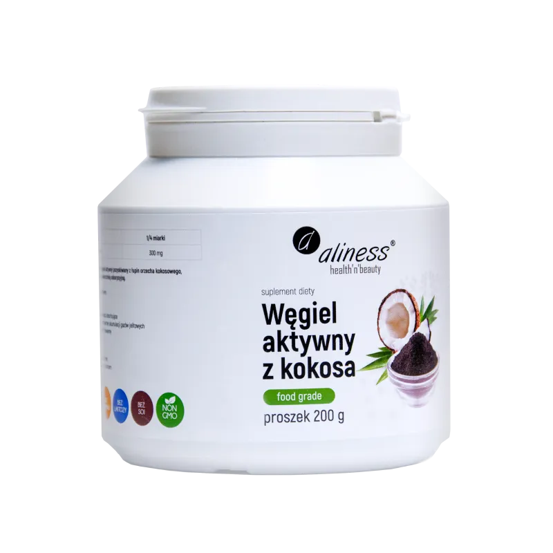 Węgiel aktywny z kokosa 200 g proszek Aliness to naturalny suplement wspierający układ pokarmowy, procesy oczyszczania organizmu i codzienną suplementację w łatwej do użycia formie proszku.