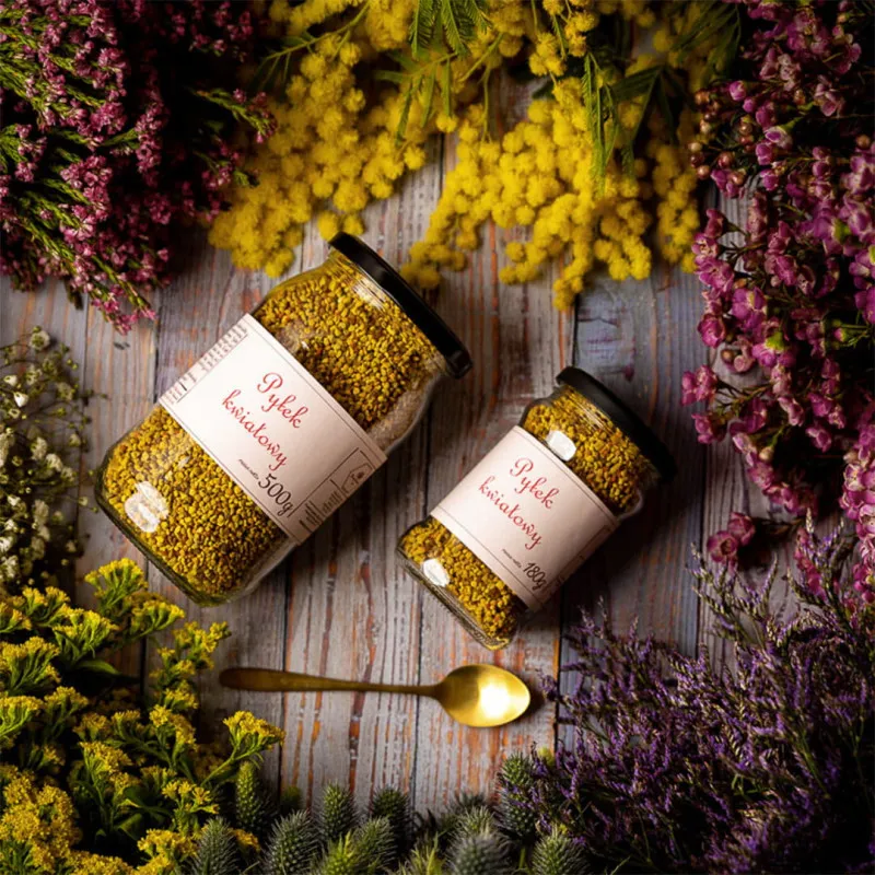 Z czystych i dzikich terenów, w sercu podkarpackiej natury, na urokliwym Pogórzu Dynowskim - skąd pochodzi nasz miód, pochodzi również nasz unikalny pyłek kwiatowy-pszczeli. Jego ulotna, delikatna formuła nie ułatwia zbiorów, ale warto się o niego postarać. Ten produkt z ula to bomba białkowo-witaminowa, pełna minerałów i mikroelementów, które fantastycznie regulują proces przemiany materii, dodają witalności, pomagają dbać o młodą i jędrną skórę, mocne włosy i kości. Pyłek ma zbawienne działanie na układ trawienny, a ze względu na właściwości detoksykacyjne, odmładza i pomaga zniwelować skutki stresu oksydacyjnego. Pyłek jest bogaty również w lipidy. Działa antybakteryjnie i przeciwgrzybiczo. To eliksir zdrowia i wiecznej młodości.