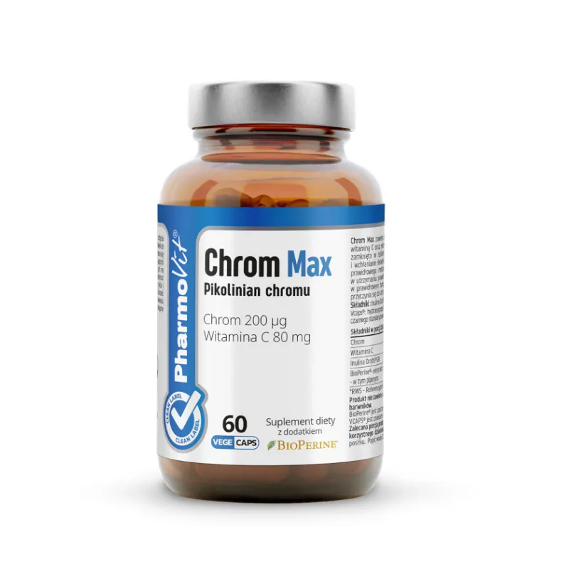 Chrom Max 200 µg Vege marki Pharmovit to suplement diety w formie kapsułek roślinnych, zawierający wysoko przyswajalny pikolinian chromu. Produkt został opracowany, aby wspierać prawidłowy metabolizm węglowodanów, tłuszczów i białek oraz pomagać w utrzymaniu prawidłowego poziomu glukozy we krwi. Kapsułki w wersji VEGE są odpowiednie dla wegan i wegetarian.