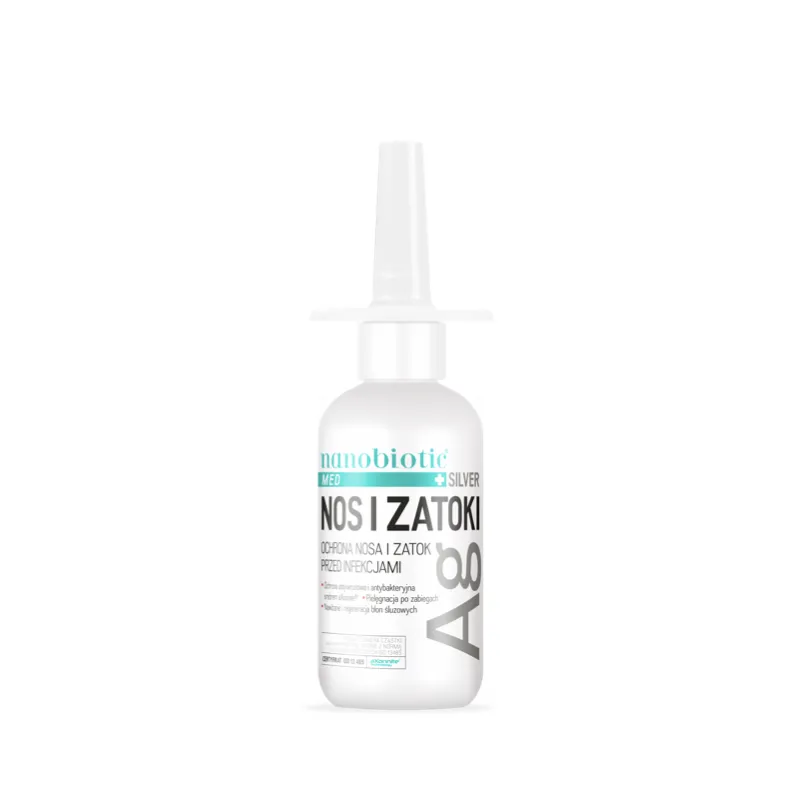 Nanobiotic® MED Silver Nos i Zatoki to wyrób medyczny w formie sprayu, opracowany z myślą o higienie i ochronie górnych dróg oddechowych. Preparat wspiera prawidłowe funkcjonowanie błon śluzowych nosa i zatok, nawilża, oczyszcza oraz łagodzi podrażnienia. Dzięki zawartości nanocząsteczek srebra, złota i miedzi aXonnite®, działa wielokierunkowo – wspomaga profilaktykę infekcji, ogranicza namnażanie patogenów oraz przyspiesza regenerację śluzówki.
