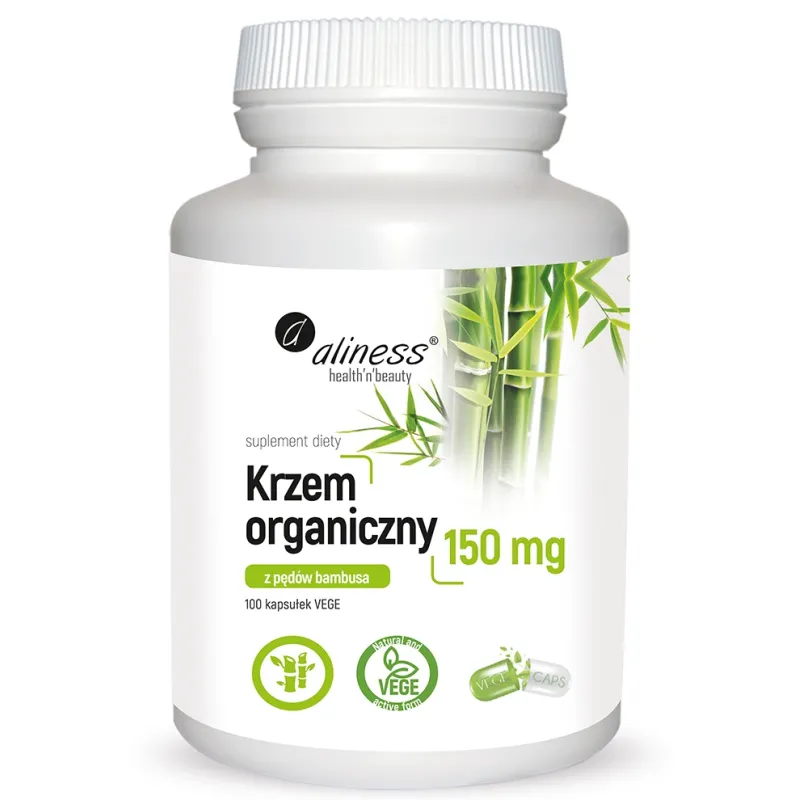 Krzem organiczny z pędów bambusa 150 mg x 100 VEGE kapsułek Aliness to naturalny suplement wspierający zdrowie skóry, włosów, paznokci oraz prawidłowe funkcjonowanie stawów i tkanki łącznej.