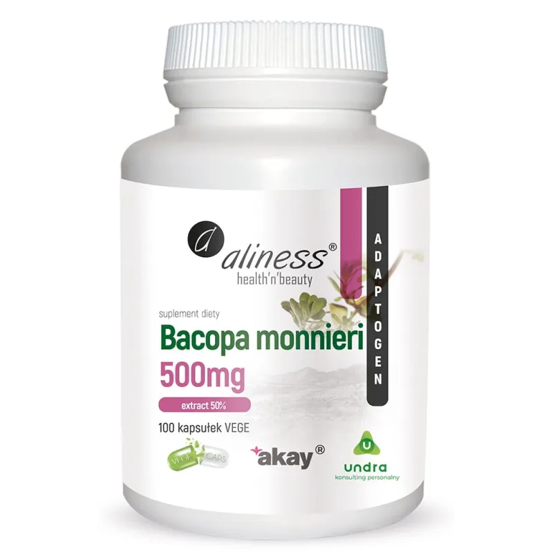 Ekstrakt z Bacopa monnieri (standaryzowany na 50% bakozydów) – 500 mg,