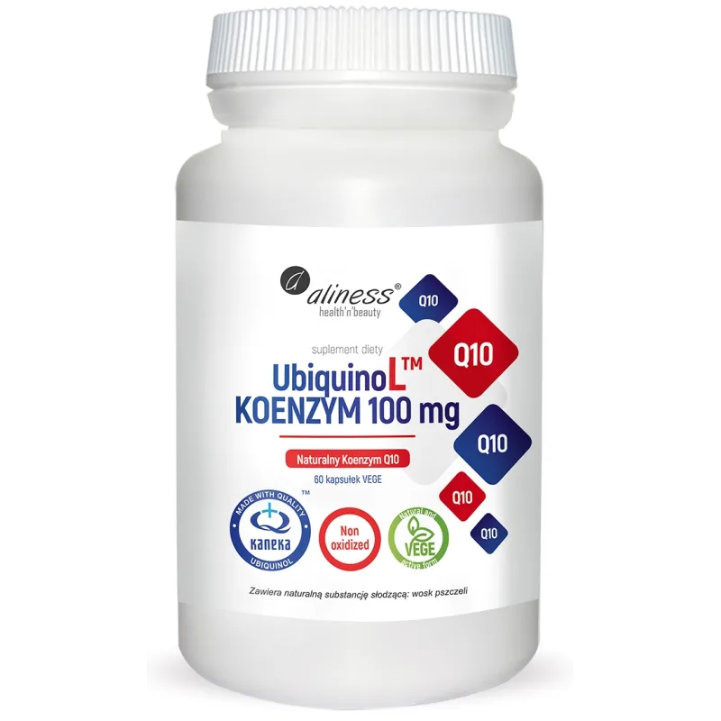 UbiquinoL® KANEKA Naturalny Koenzym Q10 100 mg Aliness to suplement najwyższej jakości wspierający witalność, energię komórkową, zdrowie serca oraz ochronę antyoksydacyjną organizmu. Idealny dla osób dorosłych, aktywnych fizycznie oraz dbających o zdrowie układu krążenia.