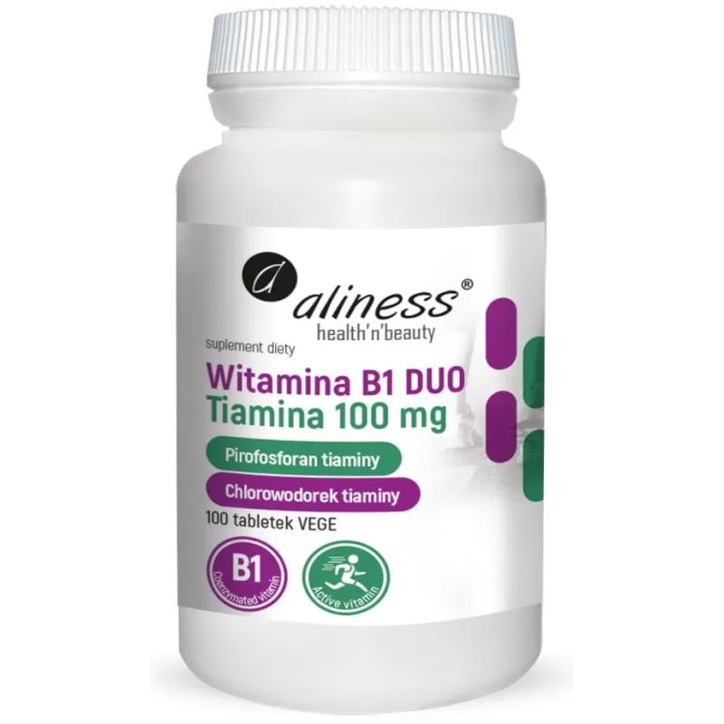 Witamina B1 (Tiamina) DUO 100 mg Aliness to skuteczny suplement wspierający metabolizm energetyczny, prawidłowe funkcjonowanie układu nerwowego, mięśni i serca. Idealny dla osób dorosłych, aktywnych fizycznie oraz w okresach zwiększonego zapotrzebowania na witaminę B1