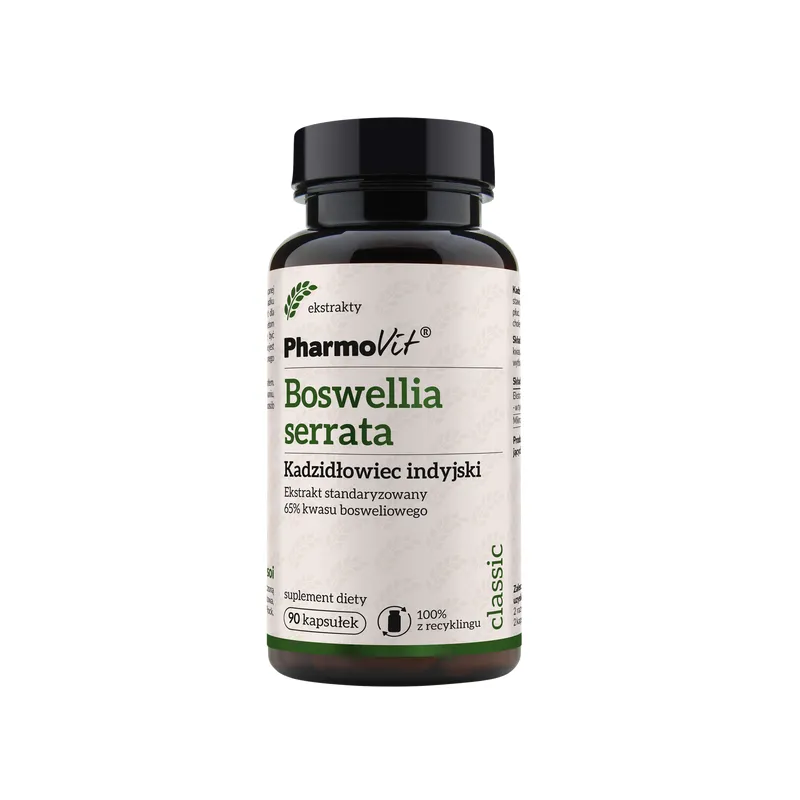 Boswellia (kadzidłowiec indyjski) 90 kaps marki Pharmovit to naturalny suplement diety wspierający prawidłowe funkcjonowanie stawów i układu mięśniowo-szkieletowego. Ekstrakt z kadzidłowca indyjskiego wykazuje działanie wspomagające elastyczność stawów oraz komfort ruchu.