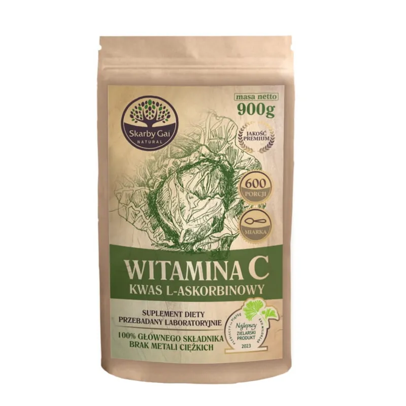 Witamina C z kapusty (kwas L-askorbinowy) w proszku 900 g marki Skarby Gai to naturalny suplement diety wspierający prawidłowe funkcjonowanie układu odpornościowego, produkcję kolagenu oraz zdrowie skóry, naczyń krwionośnych, kości i chrząstek.