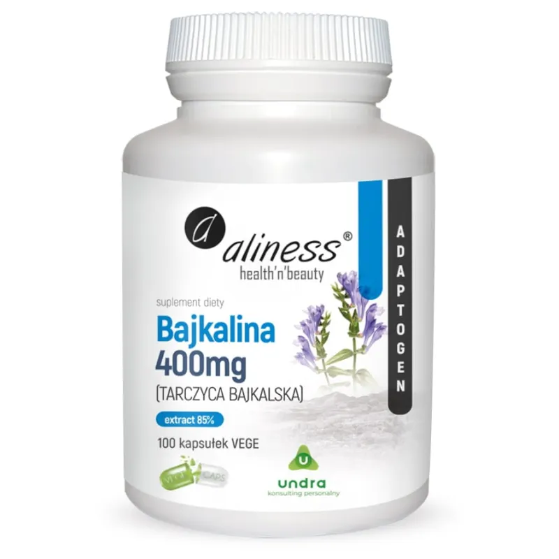Suplement diety w formie wegetariańskich kapsułek, zawierający wysokiej jakości ekstrakt z korzenia tarczycy bajkalskiej (Scutellaria baicalensis), standaryzowany na 85% bajkaliny. Każda kapsułka dostarcza 400 mg ekstraktu, w tym 340 mg bajkaliny – głównego składnika aktywnego rośliny.