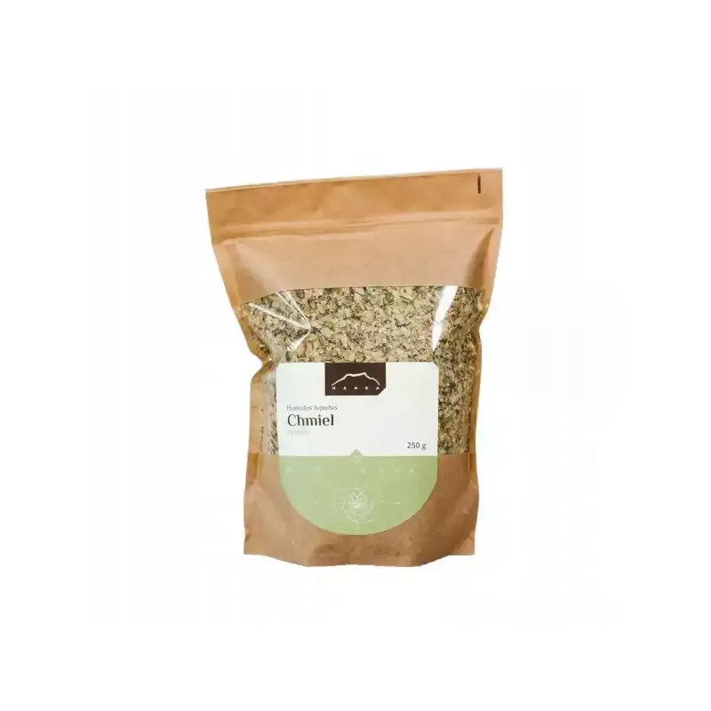 Chmiel szyszki 250 g Nanga to wysokiej jakości susz z szyszek chmielu, ceniony od wieków w ziołolecznictwie za swoje właściwości wspierające uspokojenie, zdrowy sen oraz prawidłowe trawienie. To naturalny produkt bez dodatków, pochodzący z ekologicznych upraw, idealny do przygotowywania naparów, odwarów lub jako składnik mieszanek ziołowych.