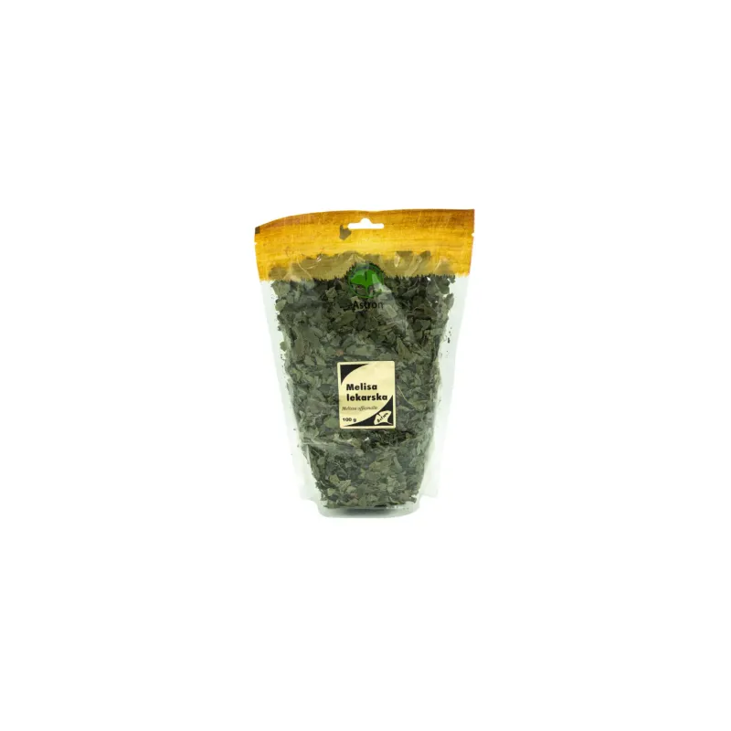 Melisa lekarska (Melissa officinalis) w postaci suszonego ziela marki Astron, opakowanie 100 g. Naturalny produkt pochodzący z upraw lub dziko rosnących roślin, stosowany tradycyjnie w ziołolecznictwie. Melisa jest ceniona za swoje właściwości wspierające relaks, wyciszenie oraz prawidłowe funkcjonowanie układu trawiennego.