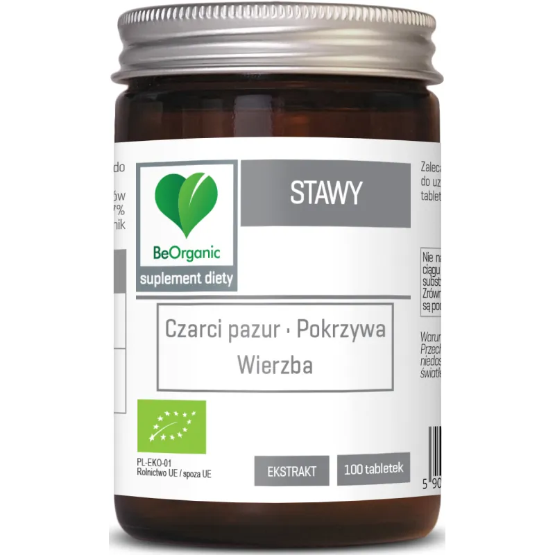 BeOrganic Stawy BIO 400 mg to ekologiczny suplement diety stworzony z myślą o osobach aktywnych fizycznie oraz tych, które chcą dbać o zdrowie stawów i ścięgien w naturalny sposób. Produkt zawiera starannie dobrane ekstrakty roślinne pochodzące z certyfikowanych upraw BIO w Polsce, pozyskiwane metodą wodnej ekstrakcji – bez chemicznych rozpuszczalników.