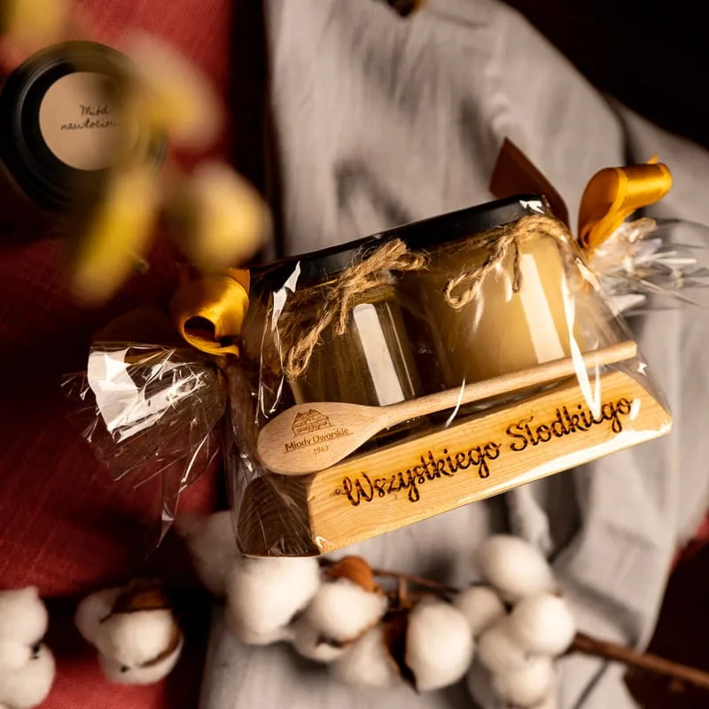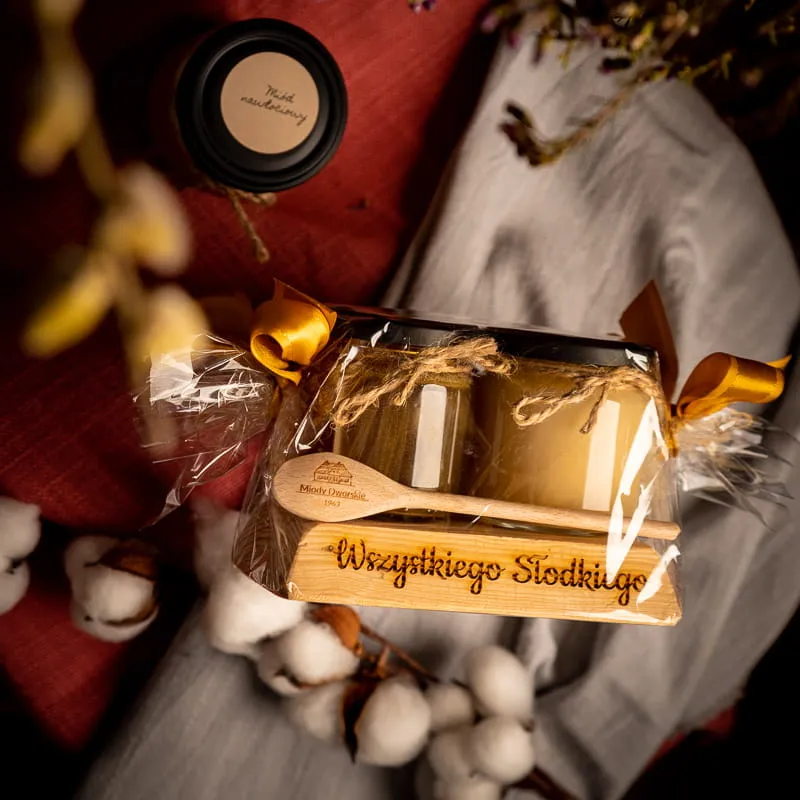 Produkt Polski – zestaw dwóch naturalnych miodów o wadze 250 g każdy, dostępnych w różnych rodzajach: wielokwiatowy, rzepakowy, lipowy, gryczany, nawłociowy, faceliowy, z terenów leśnych, miód z cynamonem, miód z orzechami laskowymi lub miód z migdałami. W zestawie znajduje się drewniana łyżeczka do miodu, idealna do serwowania i dekoracyjnego podania.