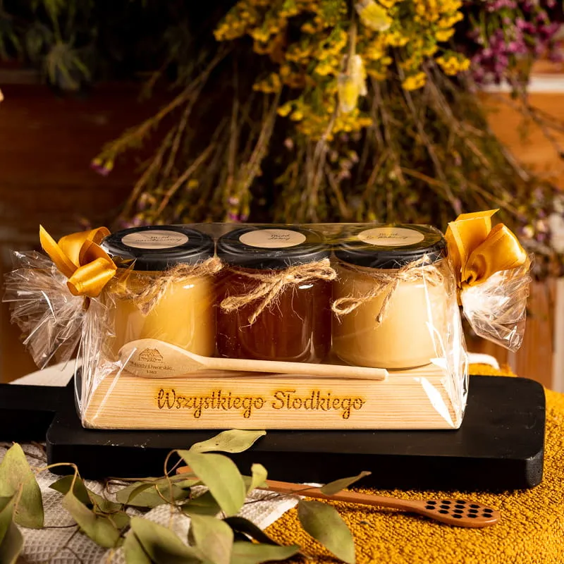Zestaw prezentowy miody na desce 3x250g nr2 Miody Dworskie