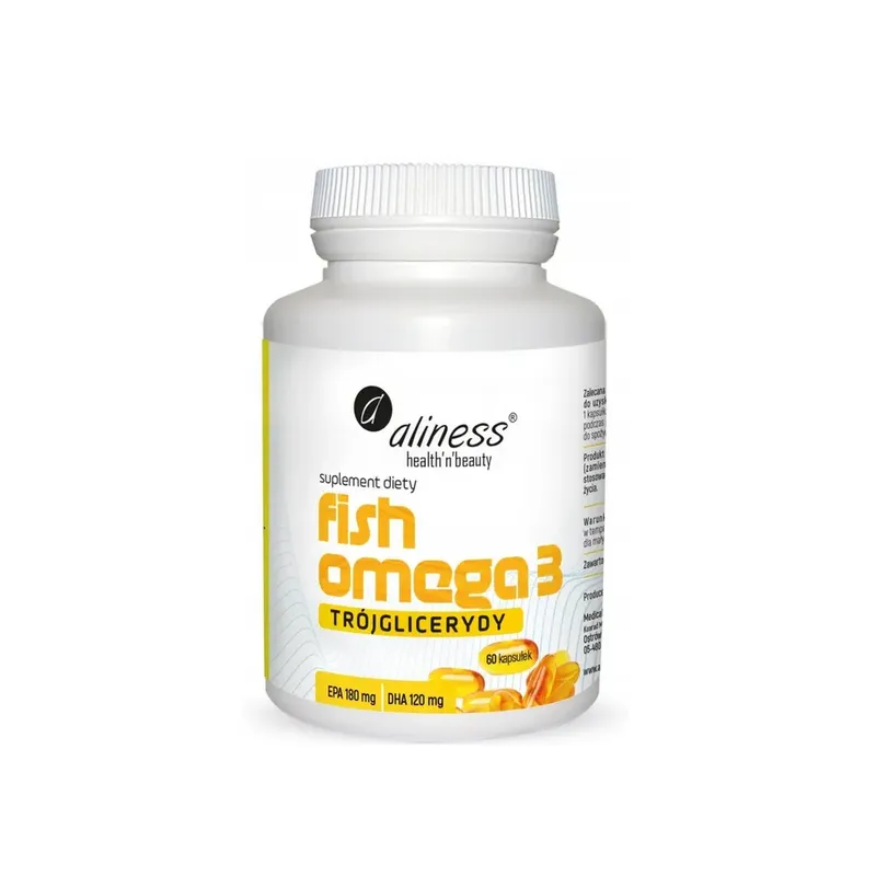 Aliness, Fish Omega 3 Trójglicerydy 180/120 mg to suplement diety w formie kapsułek, zawierający olej rybi, bogaty w kwasy omega 3: EPA i DHA. Preparat przeznaczony dla osób dorosłych.