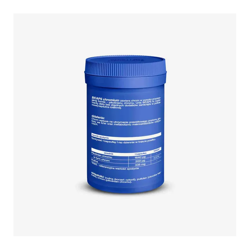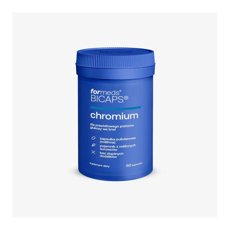 BICAPS chromium to jednoskładnikowy suplement diety zawierający chrom w wysoko przyswajalnej formie pikolinianu. Preparat został opracowany z myślą o wsparciu prawidłowego poziomu glukozy we krwi oraz metabolizmu makroskładników odżywczych.