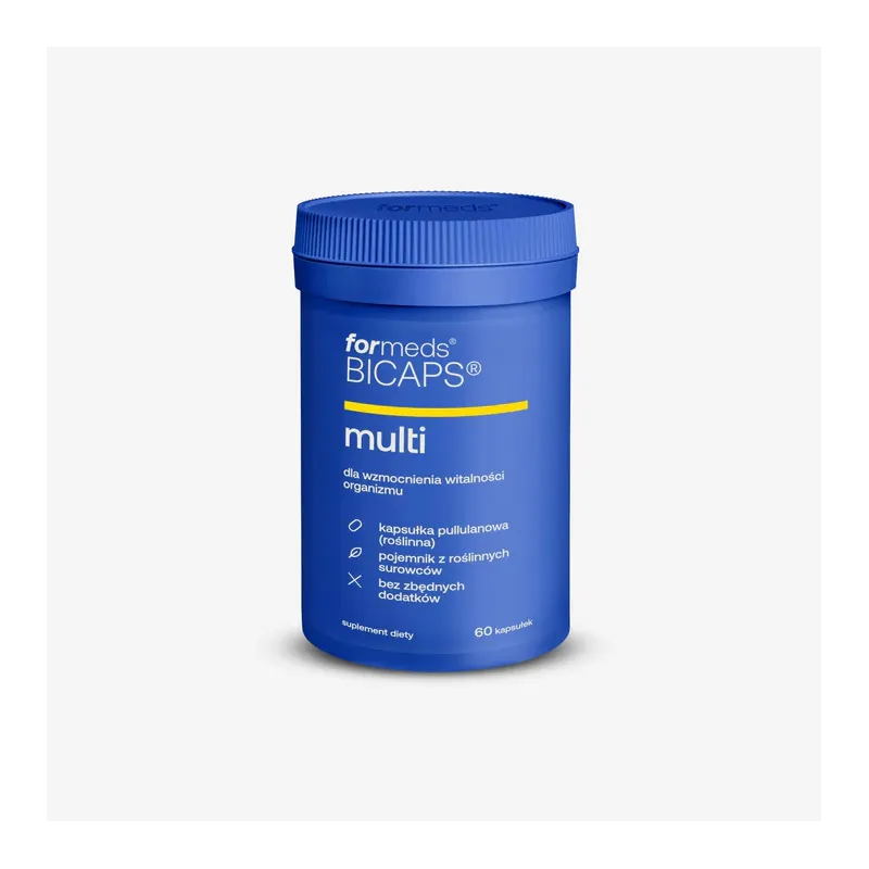 BICAPS multi to kompleksowy suplement diety zawierający 20 witamin i składników mineralnych w wysoko przyswajalnych formach, takich jak cytryniany, metylokobalamina (witamina B12), L-metylofolian wapnia oraz cytrynian cynku. Formuła została opracowana z myślą o codziennym wsparciu odporności, energii, koncentracji oraz ogólnej witalności.