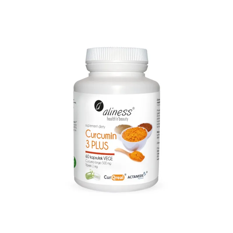 Kurkuma ekstrakt „Curcumin 3 Plus” z piperyną 500 mg/5 mg x 60 kaps. Aliness to naturalny suplement wspierający zdrowie stawów, funkcjonowanie układu odpornościowego oraz ochronę komórek przed stresem oksydacyjnym, idealny do codziennej suplementacji.