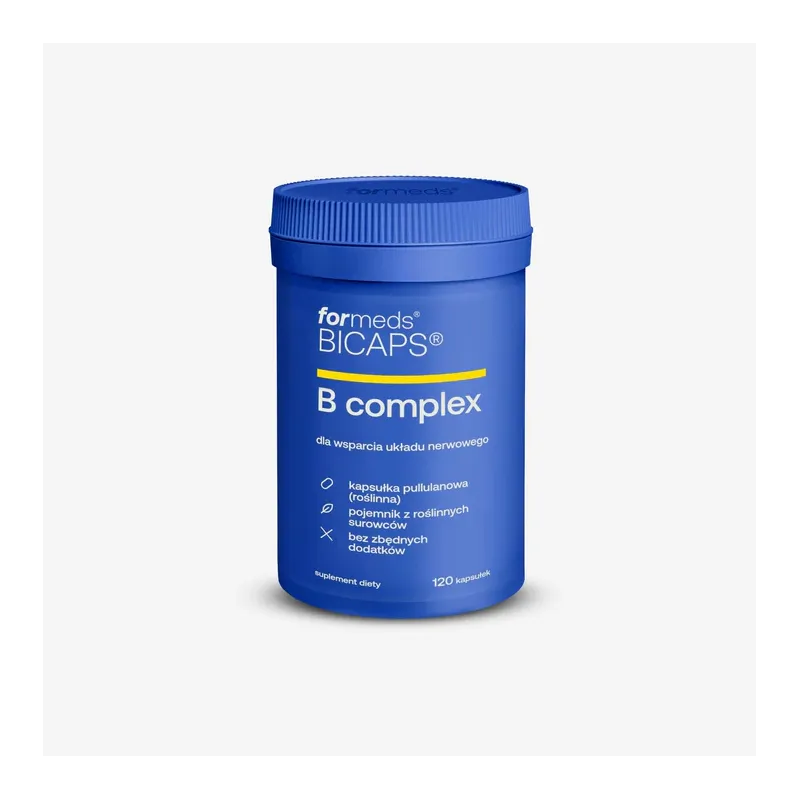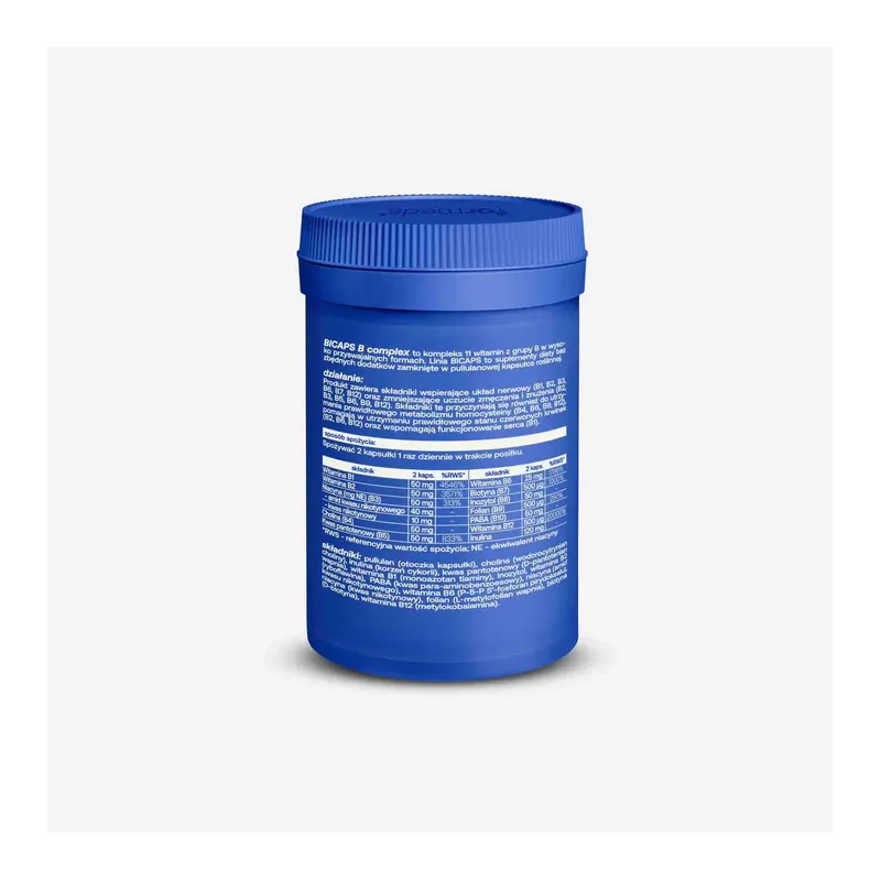 BICAPS B complex to kompleks 11 witamin z grupy B w wysoko przyswajalnych formach, w tym metylowany folian (5-MTHF) oraz metylokobalamina (B12). Formuła została dodatkowo wzbogacona o cholinę, inozytol oraz PABA. Produkt zawiera czysty skład, roślinną kapsułkę z pullulanu i jest odpowiedni dla wegan.