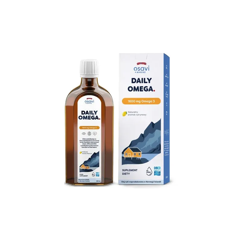 Wysoka zawartość kwasów Omega-3 1600 mg w dziennej porcji 5 ml w tym EPA 700 mg i DHA 600 mg