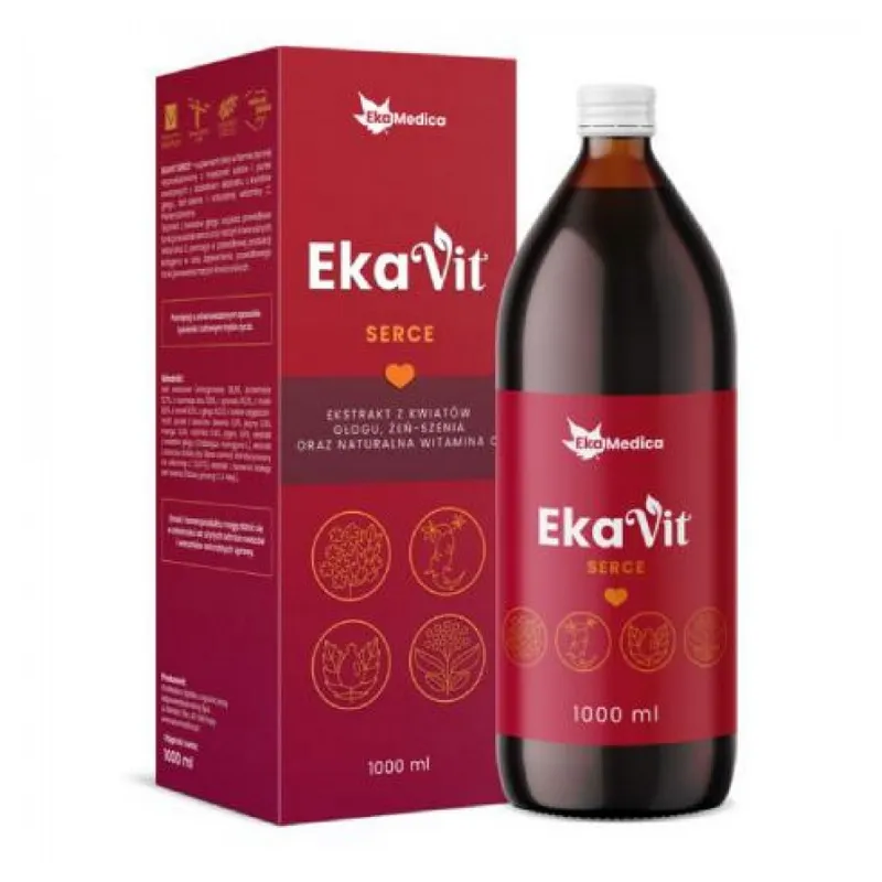 Sok EKAVIT SERCE to suplement diety w formie płynnej wyprodukowany z mieszanki soków i puree owocowych z dodatkiem ekstraktu z kwiatów głogu, żeń-szenia i naturalnej witaminy C. Pasteryzowany.