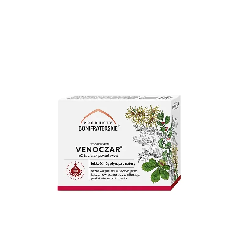 VENOCZAR® suplement diety to preparat będący owocem wielowiekowej tradycji Zakonu Bonifratrów zawierający najwyższej jakości ziołowe składniki aktywne. Zgodnie z zakonną recepturą powstałą w oparciu o 400 lat doświadczenia Braci Bonifratrów preparat zawiera ekstrakty z: ruszczyka, winogron, nostrzyka, kasztanowca, miłorzębu, perzu, krwawnika i oczaru wirginijskiego, które pomagają utrzymać dobrą cyrkulację krwi w mikronaczyniach, przyczyniają się do zmniejszenia obrzęku przynosząc ulgę i zmniejszenie uczucia ciężkości nóg oraz chronią komórki przed uszkodzeniem oksydacyjnym. Wyciąg z mumio wpływa ogólnie wzmacniająco na cały organizm.