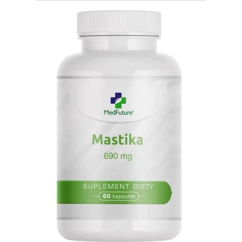 Medfuture Mastika 690 mg to suplement diety w postaci kapsułek, przeznaczony dla osób dorosłych, wspierający codzienną dietę w naturalną mastikę – sproszkowaną żywicę drzewa Pistacia lentiscus.