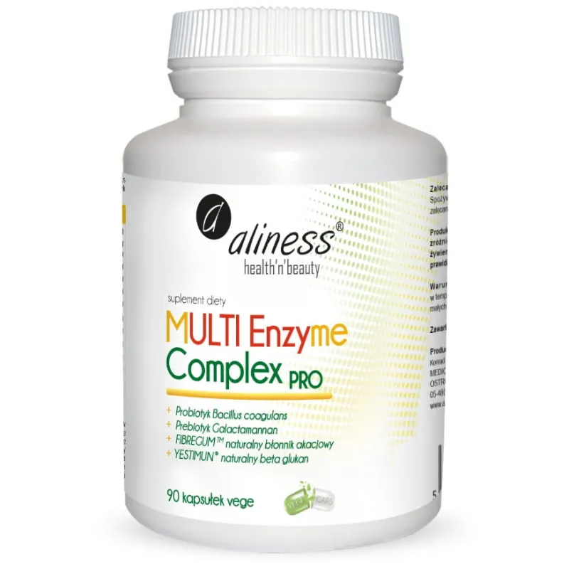 MULTI Enzyme Complex PRO to innowacyjny suplement diety stworzony z myślą o wsparciu układu pokarmowego. Produkt łączy w sobie kompleks roślinnych enzymów trawiennych, probiotyk Bacillus coagulans, prebiotyk Galactomannan oraz betainę HCL, aby wspomagać trawienie węglowodanów, białek i tłuszczów oraz prawidłowe funkcjonowanie jelit.