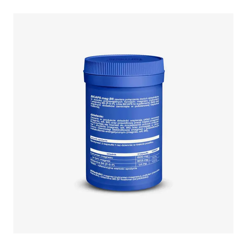 BICAPS mag B6 to suplement diety łączący magnez w wysoko przyswajalnej formie cytrynianu magnezu z biologicznie aktywną witaminą B6 w postaci 5’-fosforanu pirydoksalu (P-5-P). Formuła została opracowana z myślą o wsparciu układu nerwowego, pracy mięśni oraz utrzymaniu prawidłowego poziomu energii.