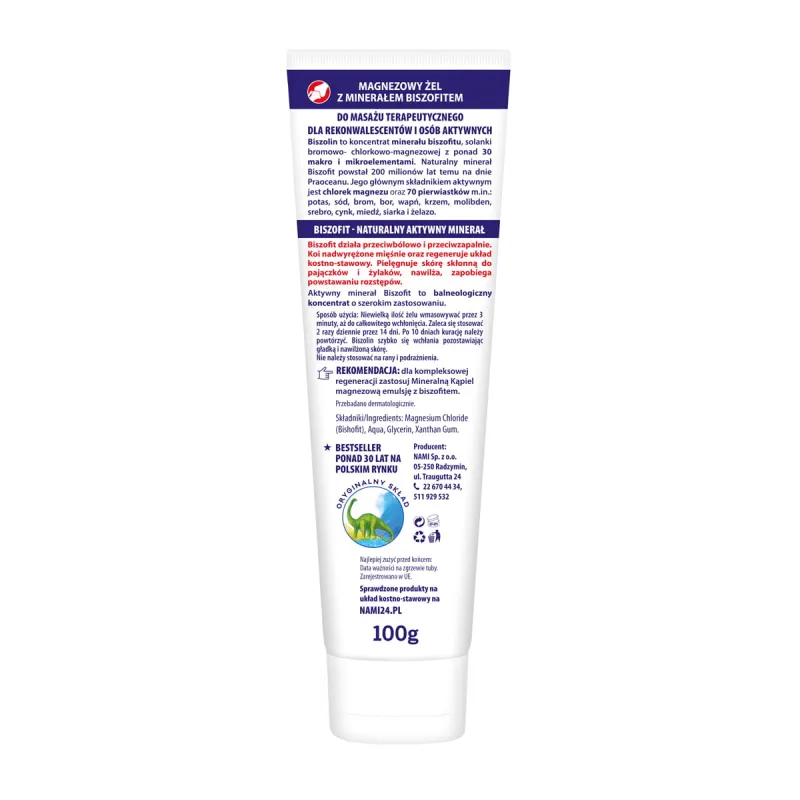 Biszolin – żel magnezowy z minerałem biszofitem 100 g marki NAMI to naturalny preparat mineralny przeznaczony do pielęgnacji skóry oraz masażu w okolicach mięśni i stawów. Produkt zawiera biszofit – naturalną solankę magnezową, która jest bogata w cenne makro- i mikroelementy wspierające regenerację skóry oraz komfort mięśni.