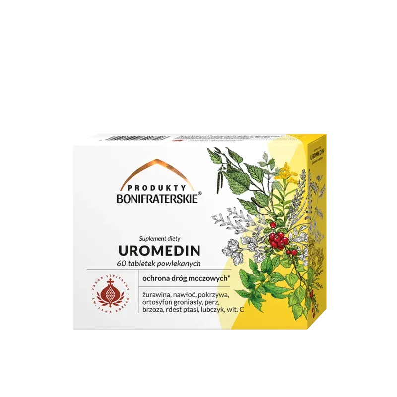 Uromedin od Braci Bonifratrów to suplement diety zawierający kompozycję 8 ekstraktów ziołowych wspierających prawidłowe funkcjonowanie dróg moczowych i nerek. Formuła wzbogacona o witaminę C oraz ekstrakt z żurawiny pomaga utrzymać zdrowie pęcherza moczowego, wspiera naturalne funkcje wydalnicze nerek oraz wspomaga usuwanie nadmiaru wody z organizmu.