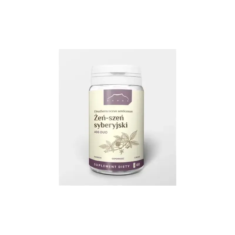 Żeń-szeń syberyjski 400 mg 60 kapsułek Nanga to suplement diety zawierający ekstrakt z korzenia Eleutherococcus senticosus – rośliny o właściwościach adaptogennych. Preparat wspiera naturalną odporność organizmu, pomaga zwiększyć energię i wytrzymałość oraz wspomaga koncentrację i sprawność umysłową. Polecany szczególnie w okresach zmęczenia, stresu i intensywnego wysiłku fizycznego lub psychicznego.